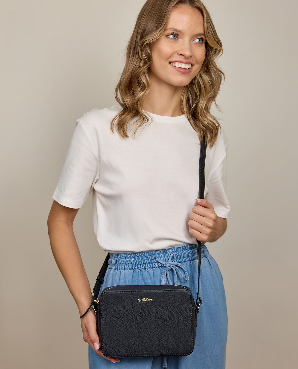 Our stylish handbag “Almina” looks good with any outfit. Our chic crossbody bag will win you over with its modern design. This petite handbag is the perfect companion when you’re browsing the shops. “Almina” is a simple, timeless, elegant bag and the perfect accessory for evenings at the theatre, the opera, or when out for dinner with friends.