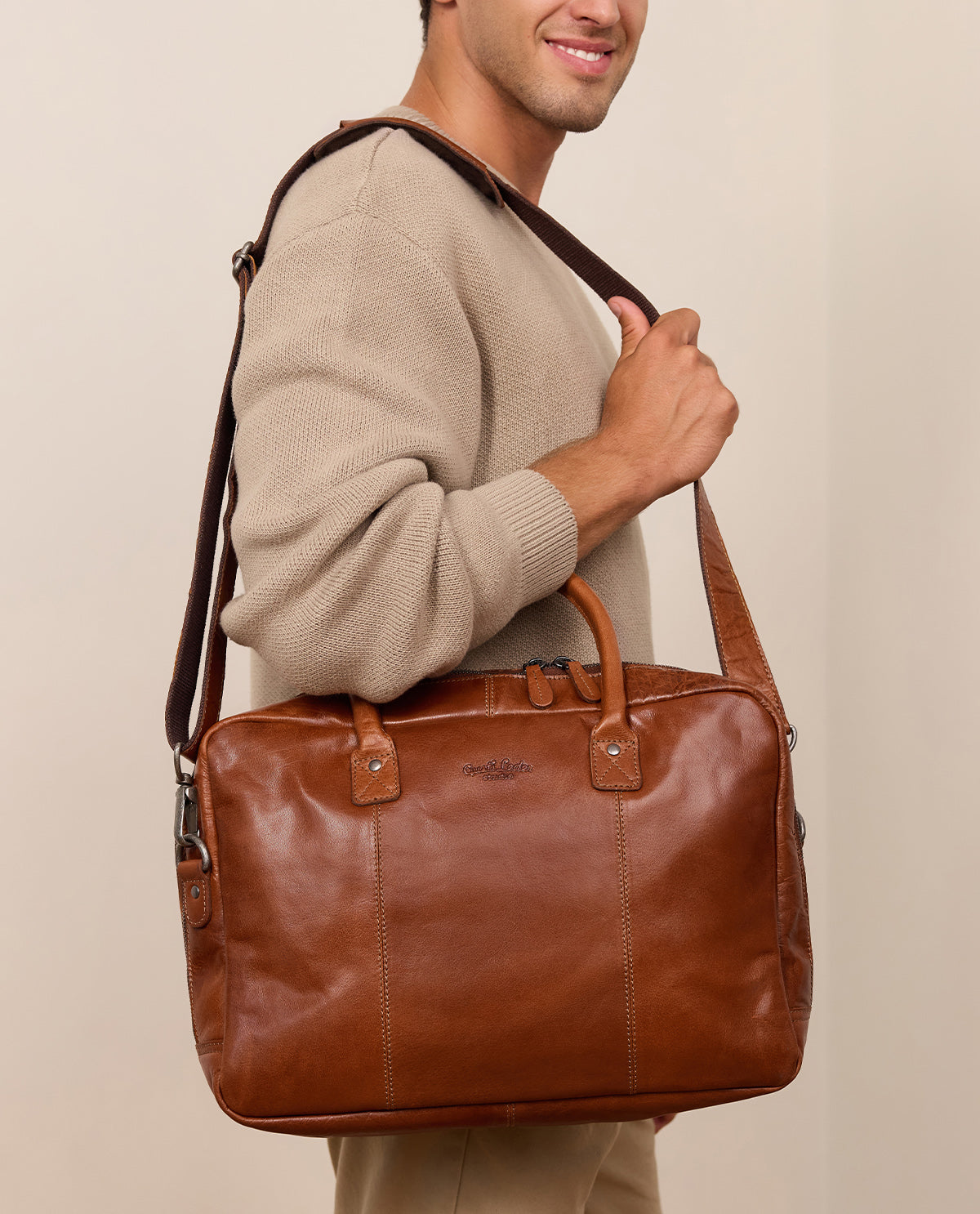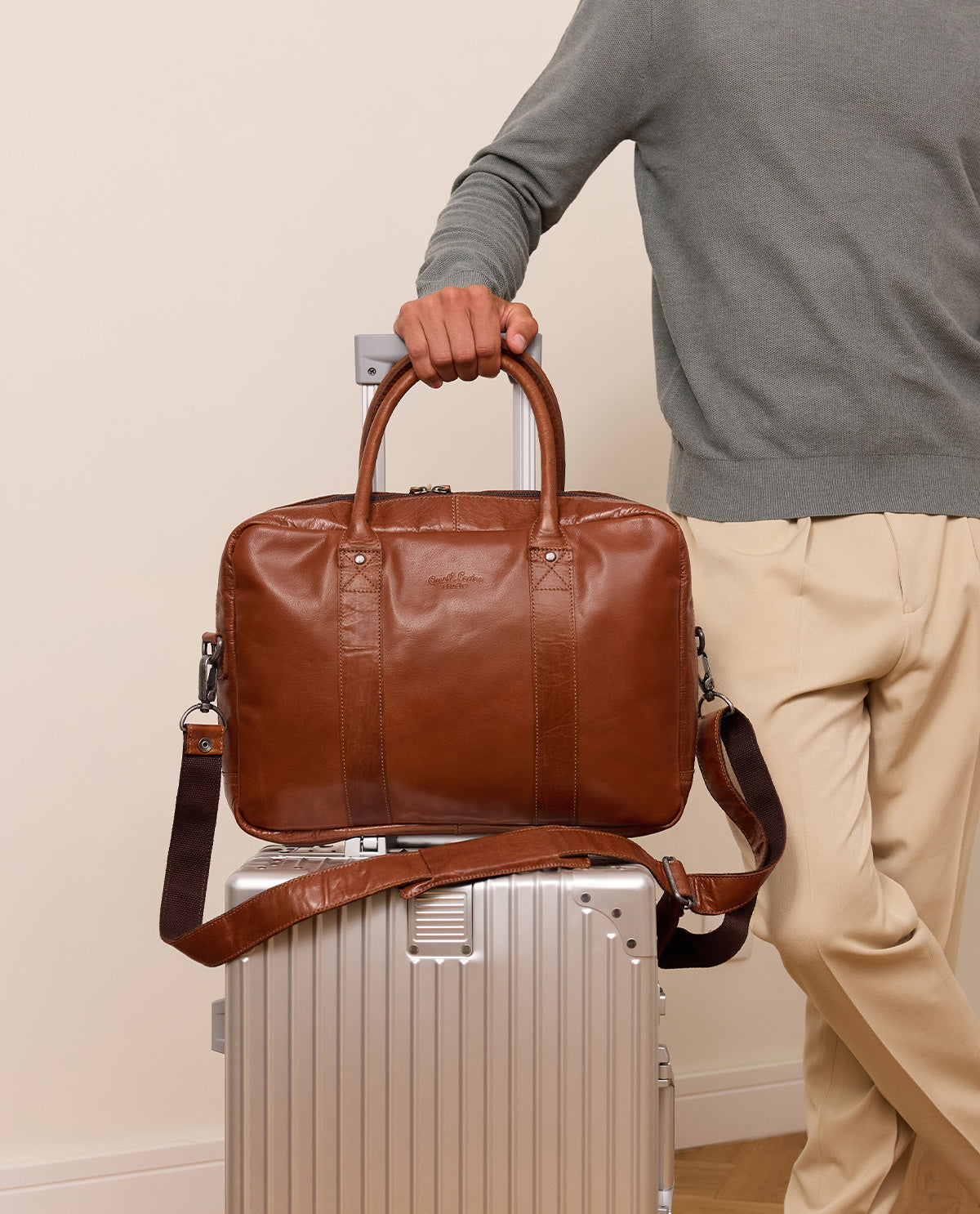 We're proud to present... “Fynn”, your new favourite leather bag. Take him to uni, the office, or the shops, our striking bag “Fynn” is everything you could want in a briefcase. He has a 15-inch laptop compartment, and pockets for your notepads and books, as well as your charger, pencil case, wallet, phone, water bottle, and keys. Take everything you need with you on your next business trip. Keep your belongings safe but easy to find thanks to the zip on the bag. Carry this briefcase in your hand or over your shoulder like a satchel using the detachable, adjustable strap. “Fynn” comes with a helpful sleeve on the back so you can slide this messenger bag onto the top of your suitcase.