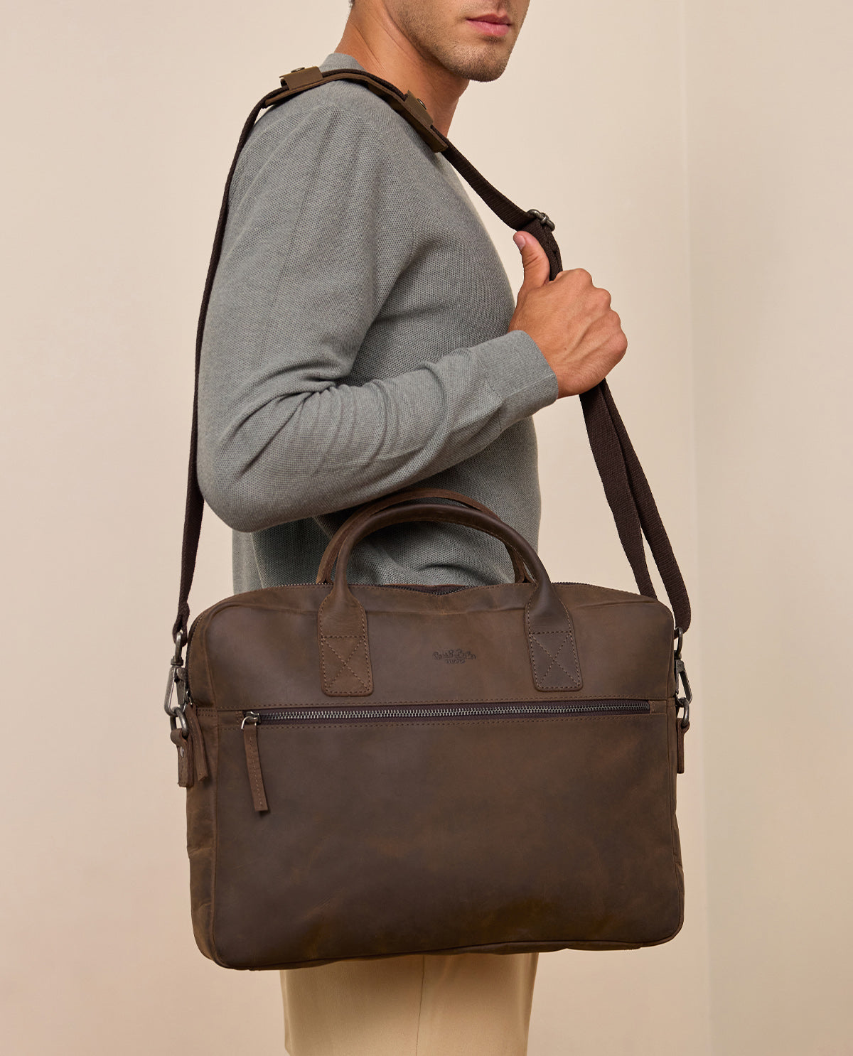 Inside, the "Elijah" impresses with its well-thought-out organization: in addition to the laptop compartment, you will find a secure zippered inner compartment and two slip pockets inside, where you can neatly store accessories, a notebook, or a charger. The padded shoulder strap ensures comfortable carrying even on longer journeys. The "Elijah" impresses not only with its appearance, but also with its careful workmanship. The buffalo leather is carefully processed by experienced craftsmen, giving the bag a particularly long life and robustness. You will enjoy this stylish and functional companion for a long time, as it will always be at your side in your everyday business life.