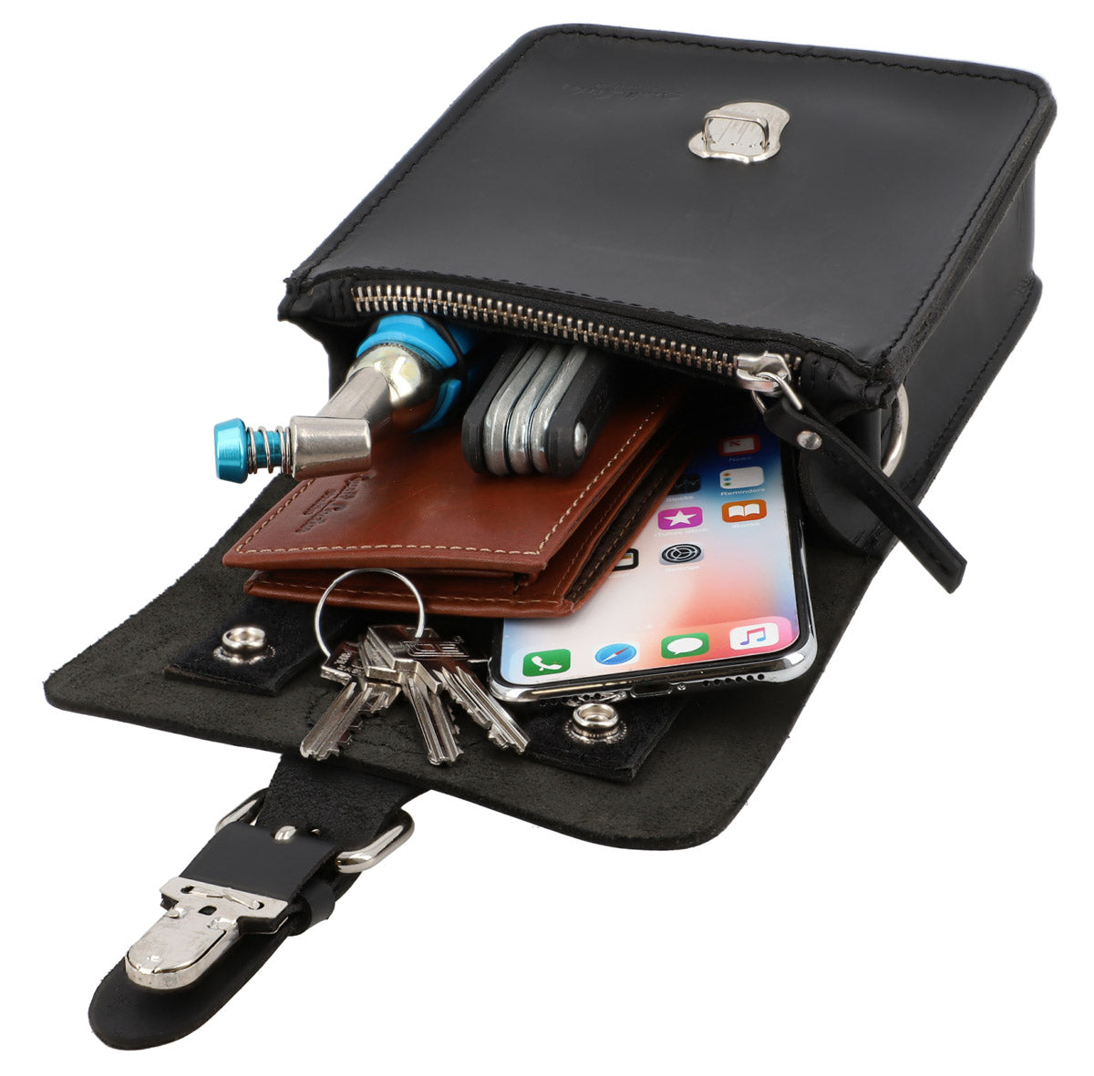 Your new leather companion is made of sturdy, high-quality process buffalo leather and will win you over with its trendy satchel style. “Cadel E.” is perfect to use as your day-to-day bag and can be attached to your handlebars quickly and easily using the straps on the back. The main compartment has more than enough space for your wallet or purse, phone and keys. The zipped pocket on the front of the bag provides you with a space to keep your smaller items. So, you'll always know where your things are. Secure this handlebar bag using the push lock and head off on an adventure.
