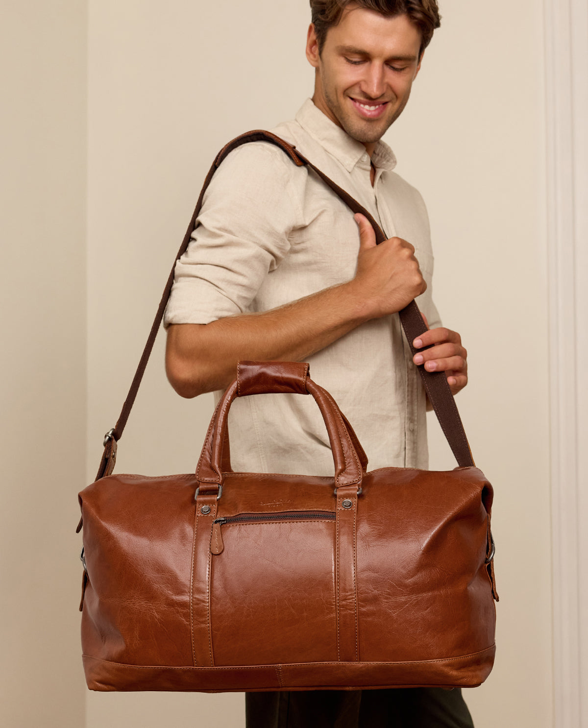 A stylish leather travel bag with a water-resistant lining and plenty of space