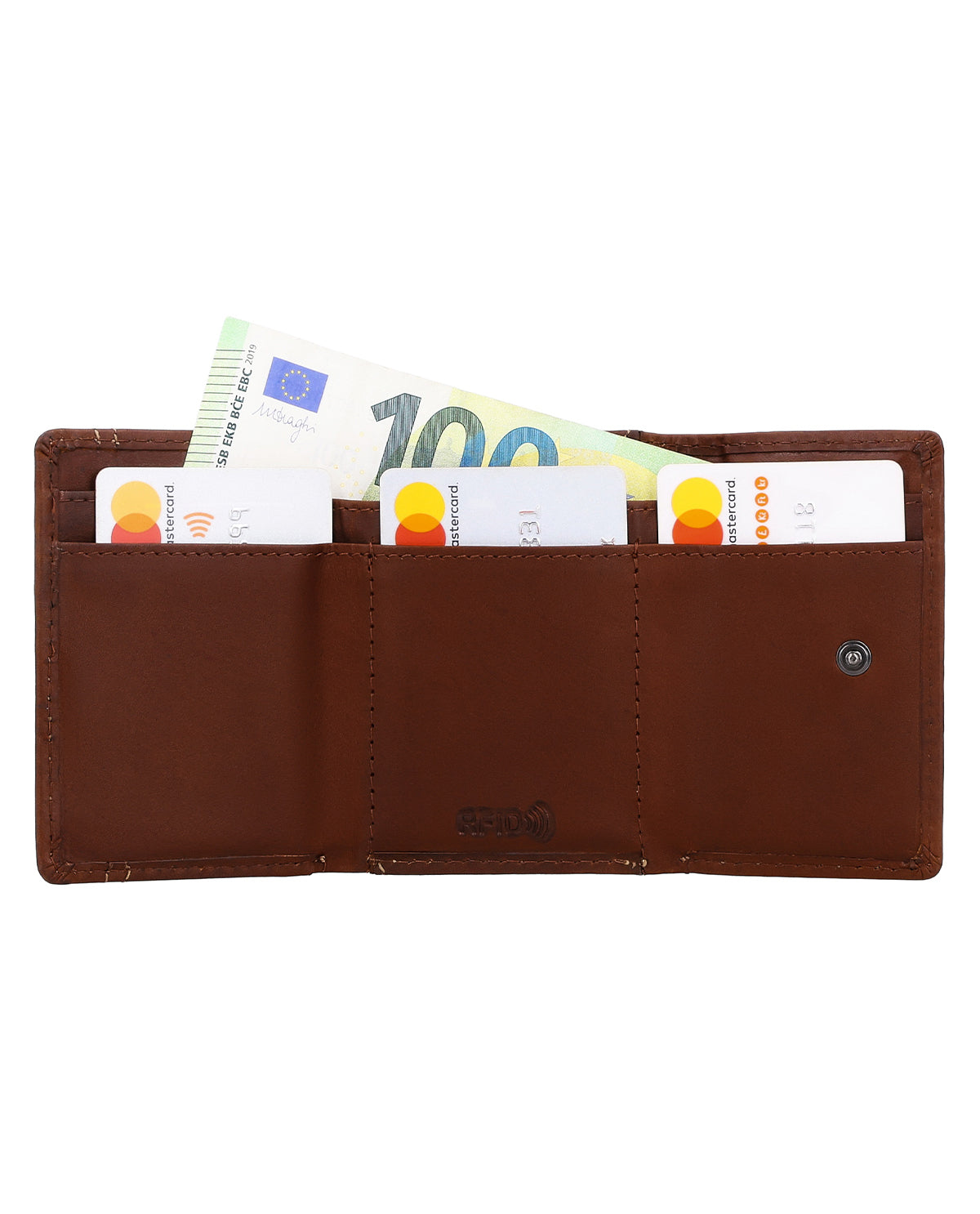 "Ronald" überzeugt im Inneren durch 3 Einschubfächer, einem Geldscheinfach und einem Münzfach vorne, welches mit einem Druckknopf geschlossen wird. So kann nichts rausfallen und alles bleibt geordnet. Für Kleingeld-Fans gibt es zusätzlich ein extra Münzfach für eine einzelne Münze – perfekt, wenn Du mal schnell eine passende Münze griffbereit haben möchtest. Zusätzlich verfügt "Ronald" noch über ein Einschubfach hinten - für den einfachsten Zugang.