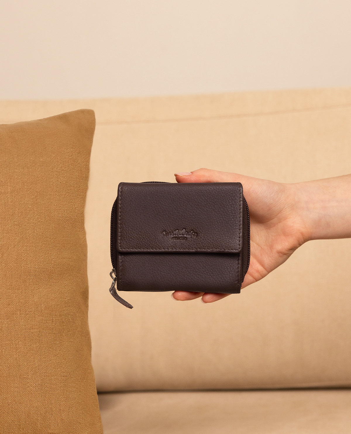 Im Inneren von "Brigitta" findest Du ein Geldscheinfach, ein ausklappbares Sichtfenster, Platz für bis zu sechs Karten sowie ein separates Münzfach mit Reißverschluss, das zuverlässig verhindert, dass Münzen herausfallen. Der Druckknopfverschluss aus hochwertigem Leder hält alles sicher zusammen. Mit dem eingenähten RFID-Blocker werden die Signale Deiner Karten blockiert, sodass Unbefugte keine Chance haben, Deine Daten auszulesen. Ein kompaktes, stilvolles und sicheres Portemonnaie für jeden Tag.