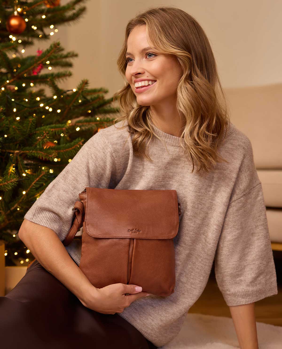 Mit ihren drei Reißverschlussfächern sorgt "Veha" für perfekte Organisation und Übersicht – ideal, um Smartphone, Schlüssel, Portemonnaie oder Kosmetik sicher und getrennt voneinander zu verstauen. Die zwei zusätzlichen Vordertaschen ermöglichen Dir schnellen Zugriff auf Dinge, die Du griffbereit halten möchtest. Das klare, rechteckige Design sorgt für eine moderne Silhouette, während der warme Braunton der Tasche jedem Outfit eine elegante Note verleiht. Mit "Veha" bist Du für Alltag, Reisen oder Stadtbummel stilvoll und organisiert unterwegs.