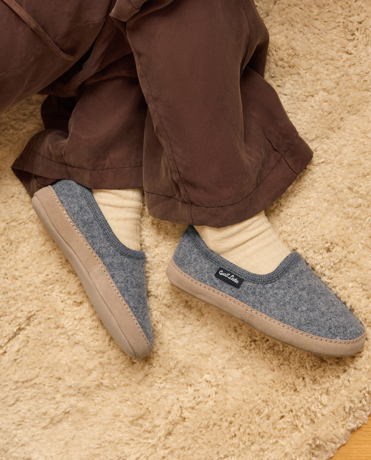 Die Laufsohle aus echtem Leder sorgt für eine flexible Basis und stille Schritte auf allen Bodenbelägen, während die gepolsterte Innensohle aus Schurwolle ein federndes Laufgefühl vermittelt, als würdest Du auf Wolken gehen. Die Hausschuhe werden in Europa – in Österreich und Ungarn – hergestellt und stehen für nachhaltige Verarbeitung und natürliche Materialien. Ein kleines Stofflabel mit dem weißen "Gusti Leder"-Logo sowie ein gewebtes Größenlabel im Fersenbereich runden die hochwertige Verarbeitung ab. Mit "Marah" genießt Du Komfort, Stil und Umweltbewusstsein in einem Schuh.