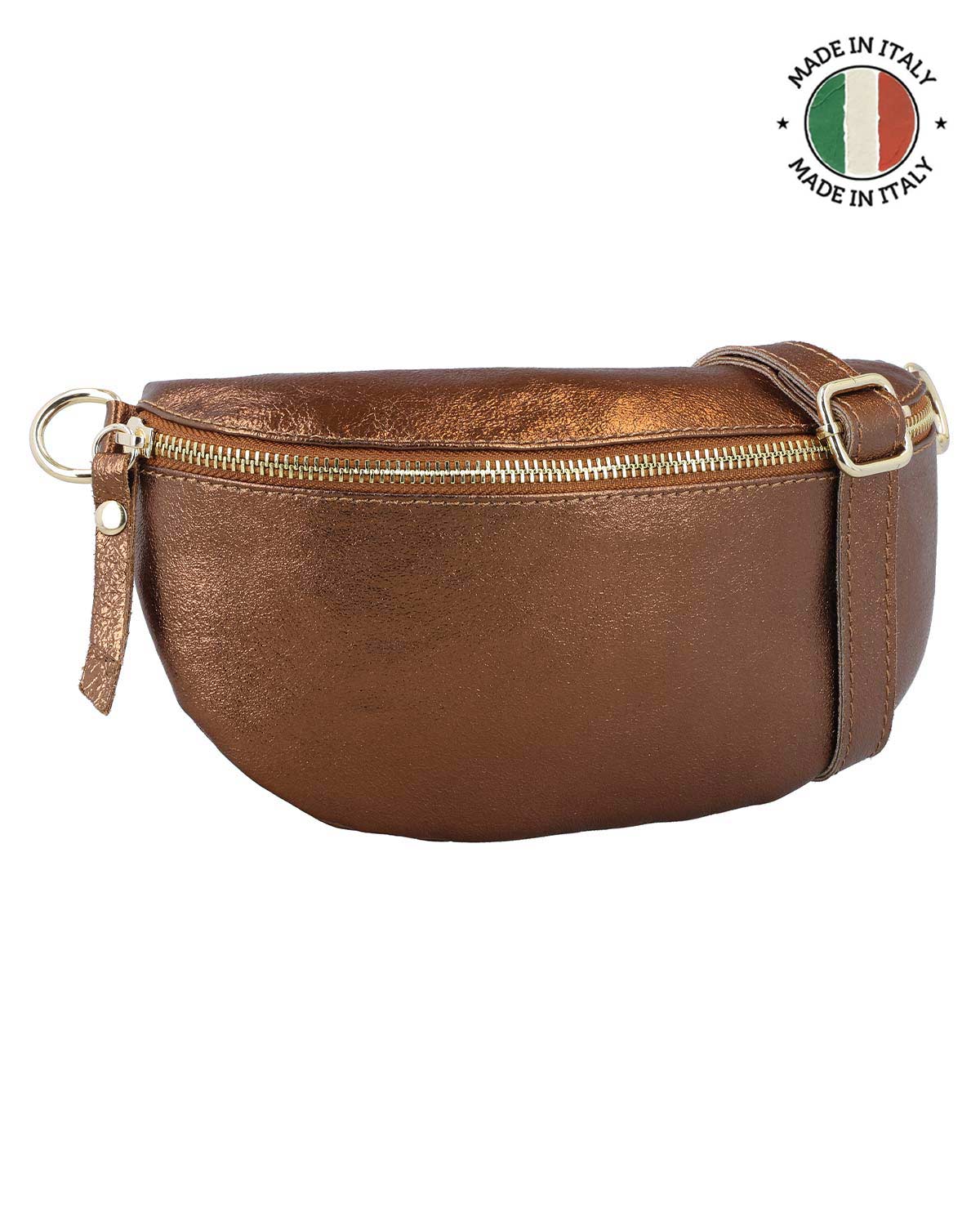Gürteltasche Bauchtasche Umhängetasche Crossbody Tasche Ledertasche Damen Braun Glänzend Leder - Made in Italy