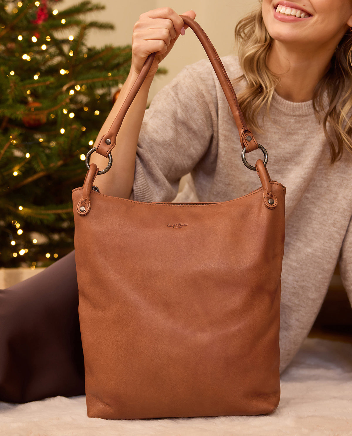 Der "Cathy" Shopper ist die perfekte Mischung aus praktischer Funktionalität und elegantem Design. Gefertigt aus hochwertigem braunem Leder, überzeugt sie mit robusten, runden Griffen, die durch Metallringe verstärkt und mit X-genähtem Lederdetail versehen sind. Der Reißverschluss mit Ledergriff sorgt dafür, dass Deine persönlichen Gegenstände jederzeit sicher und geschützt sind. Das großzügige Innenfach, das mit strapazierfähigem Baumwollstoff ausgekleidet ist, bietet ausreichend Platz für alles, was Du im Alltag benötigst.