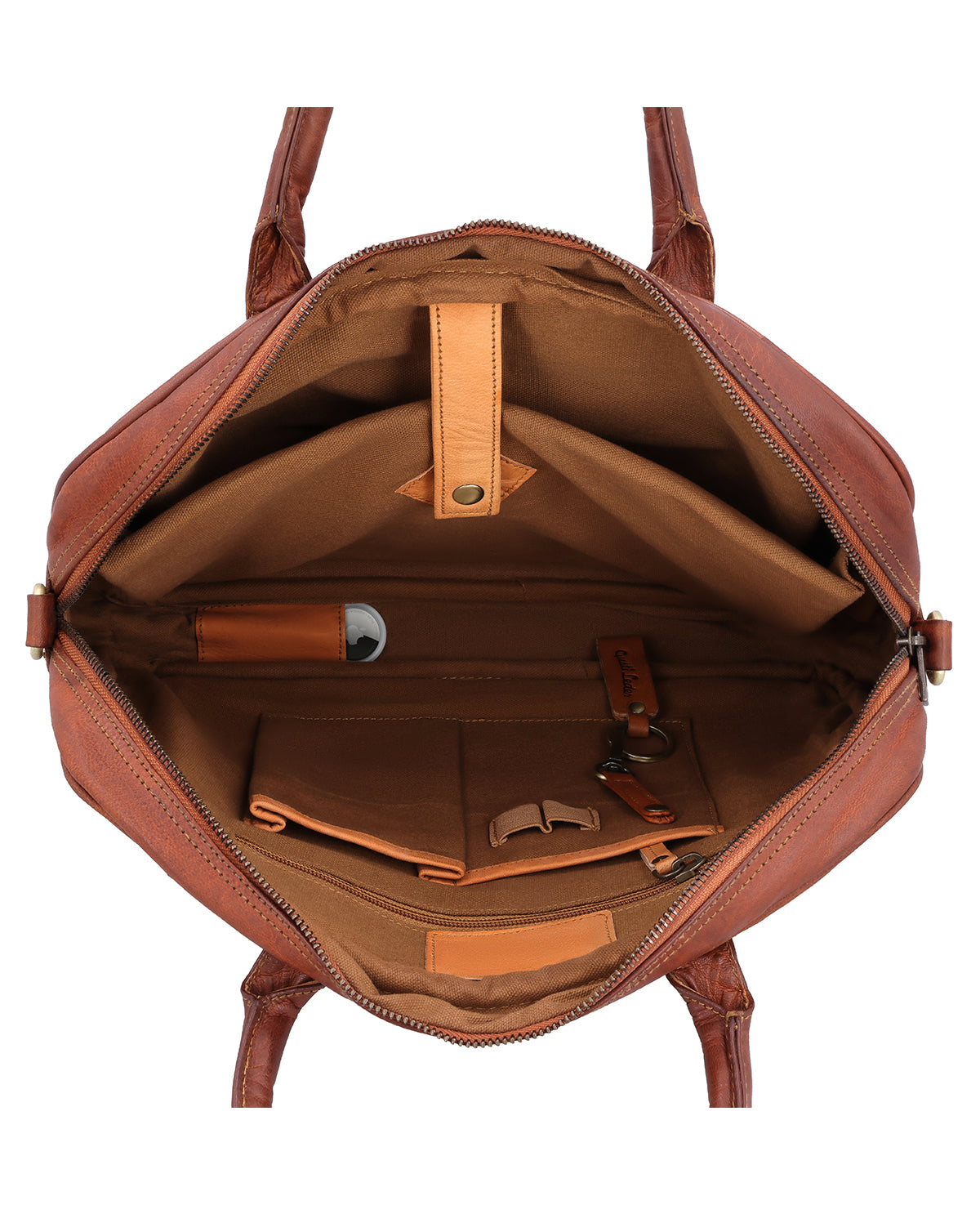 Mit "Cassius" entscheidest Du Dich für eine Aktentasche, die Eleganz, Funktionalität und Komfort perfekt vereint. Gefertigt aus hochwertigem Leder überzeugt sie durch ihre klare Linienführung und ihre durchdachte Innenaufteilung. Das Hauptfach mit Reißverschluss bietet großzügigen Stauraum, während das gepolsterte Laptopfach Deinen Computer sicher schützt. Im Inneren findest Du zwei Steckfächer, ein Reißverschlussfach sowie Stifthalter und einen abnehmbaren Schlüsselringhalter, damit alles seinen Platz hat. Ein integriertes AirTag-Fach sorgt dafür, dass Du Deine Tasche jederzeit wiederfindest – ideal für Deinen modernen Arbeitsalltag.