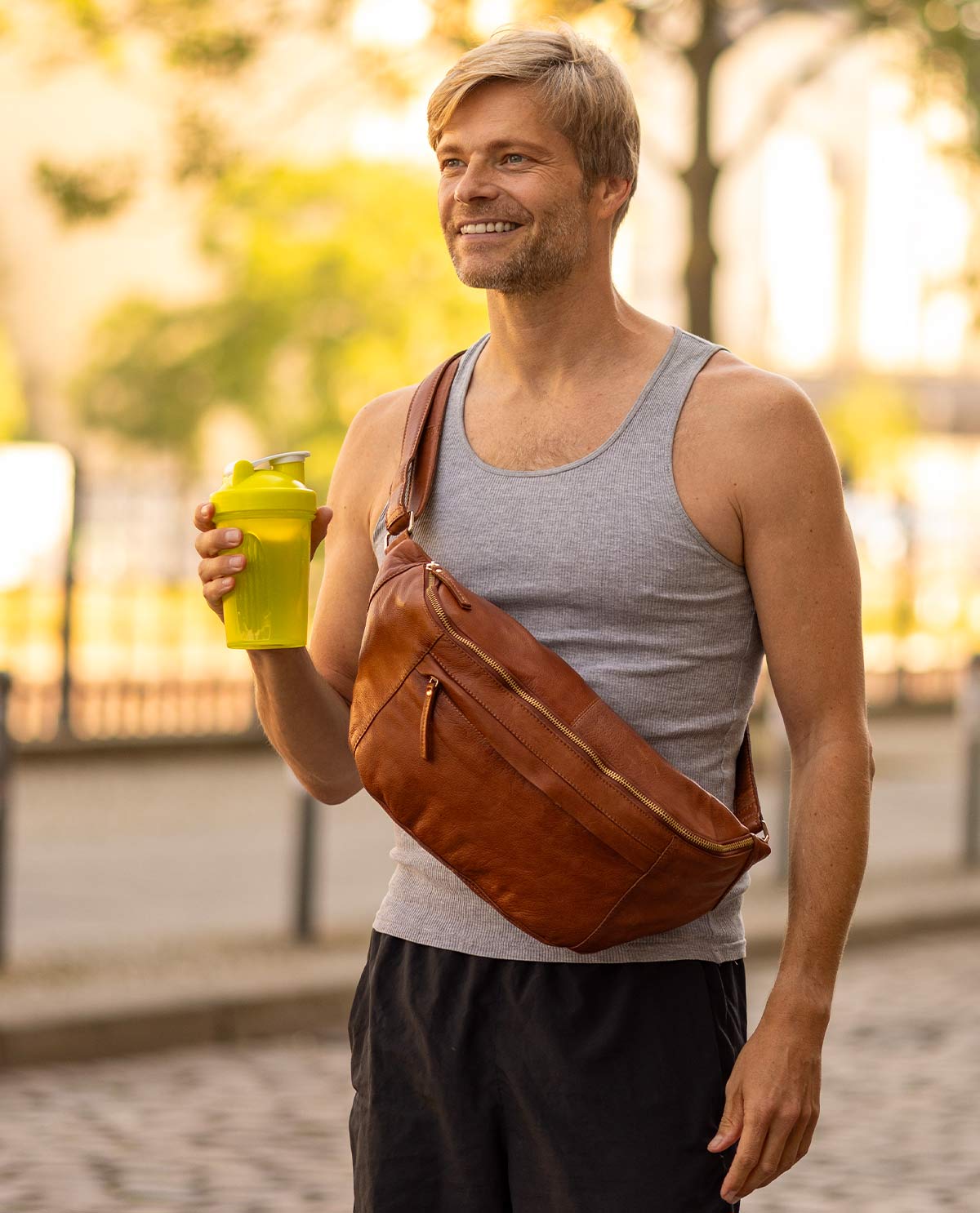 Denn diese geräumige Tasche aus widerstandsfähigem Rindsleder im Format einer großen Bauchtasche kombiniert alle Vorteile eines kompakten Rucksacks mit dem absolut angesagten, lässig-coolen Bellybag-Style - nicht zuletzt auch wegen der angenehm-weichen Beschaffenheit des Leders und dem Chic silberbener Reißverschlüsse. Auf diese Weise kann Dich "Esben" überall hin begleiten, ohne dass Du auf deine liebsten Habseligkeiten oder einen coolen Auftritt verzichten musst. Schließlich bietet "Esben" für Dein Smartphone, Schlüssel und Portemonnaie, Taschenkalender, Stifteetui und noch einiges mehr einfach immer genügend Platz!