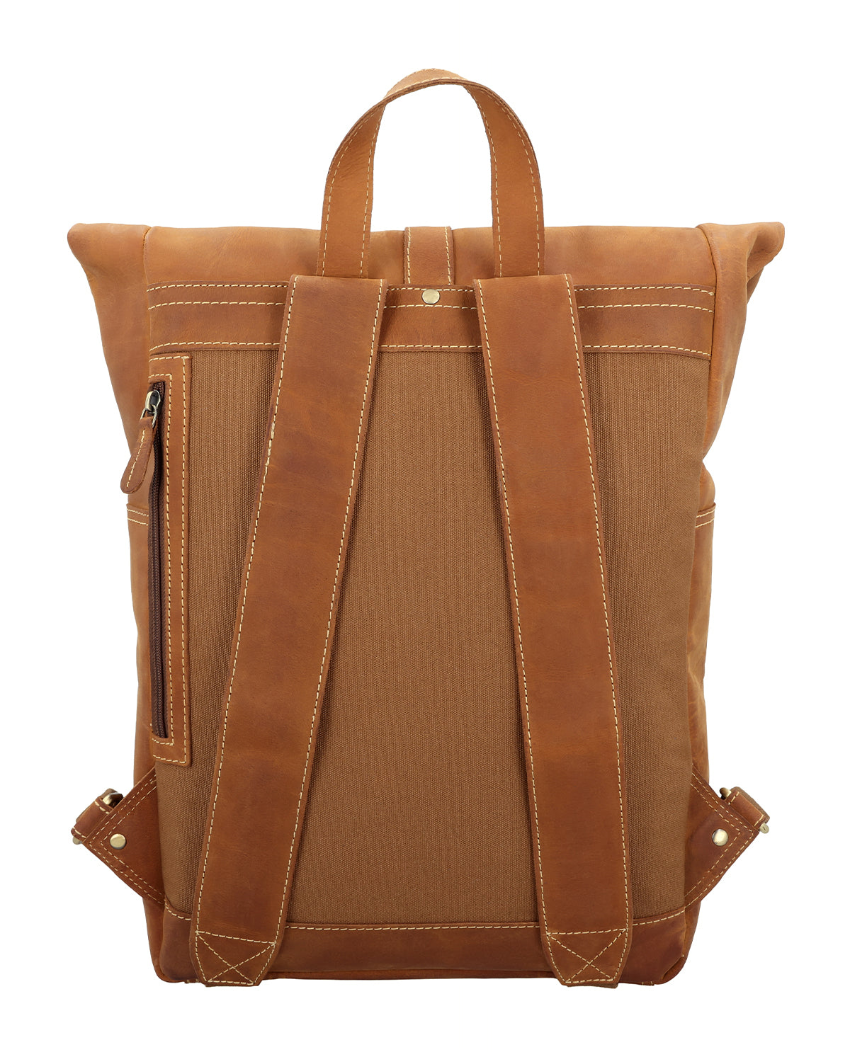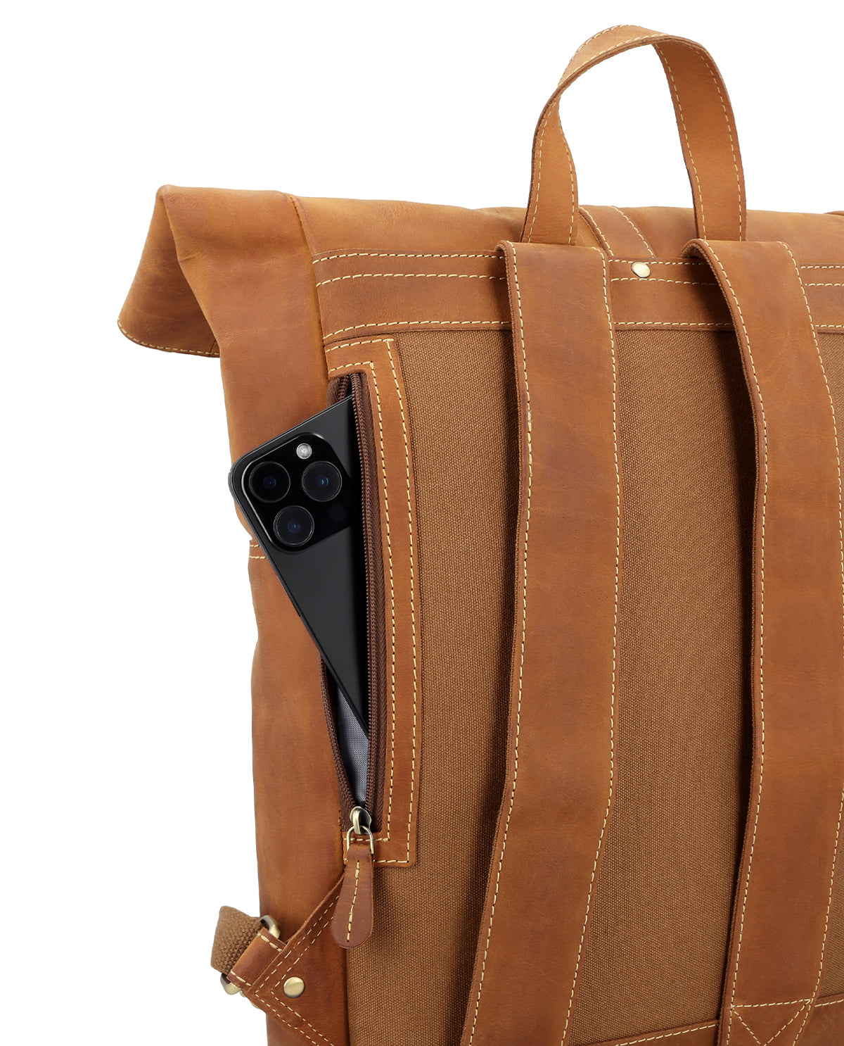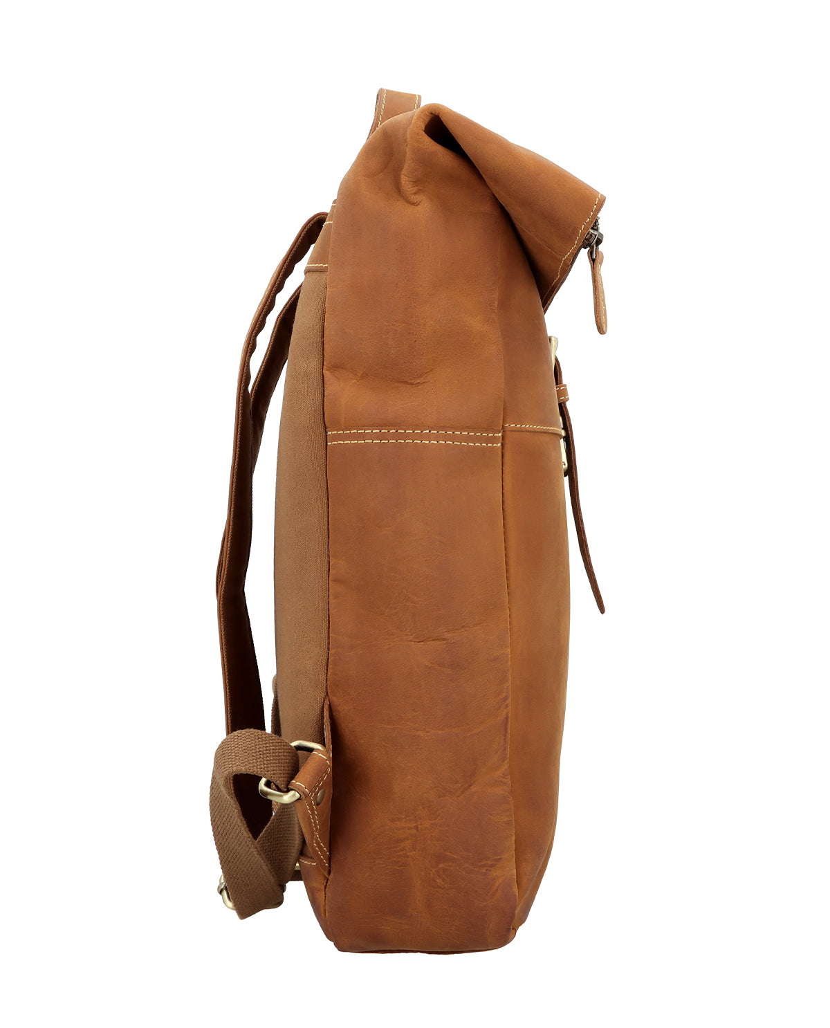 "Henning" ist ein mittelgroßer Rolltop-Rucksack aus widerstandsfähigem Büffelleder, der durch seinen schlanken Schnitt perfekt für das Großstadtgewirr oder die Enge der S-Bahn zur Rush Hour geeignet ist. Die durchdachte Aufteilung bietet Dir ausreichend Raum, um Deine DIN A4-Unterlagen, Dein 15-Zoll-Notebook, mehrere Bücher und eine große Trinkflasche im geräumigen Hauptfach zu verstauen. Zusätzlich helfen Dir ein Steckfach und ein Reißverschluss-Innenfach, Deine Habseligkeiten organisiert zu halten. Sollte mal etwas auslaufen, schützt der helle Innenstoff aus wasserfestem Polycotton das Leder vor Nässe und Flecken. Das seitliche Reißverschlussfach außen bietet Platz für Dinge, die Du schnell griffbereit haben möchtest. Die gepolsterte Rückenpartie und die Innenseite der breiten Schulterriemen sind mit braunem Canvas bezogen und sorgen für eine Extraportion Tragekomfort.