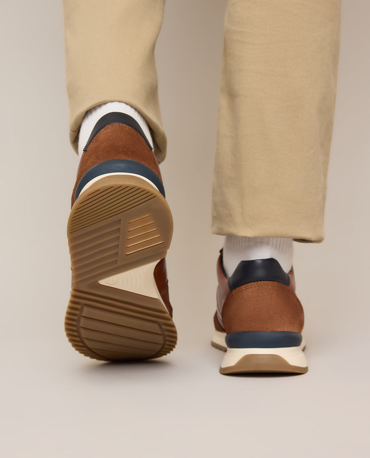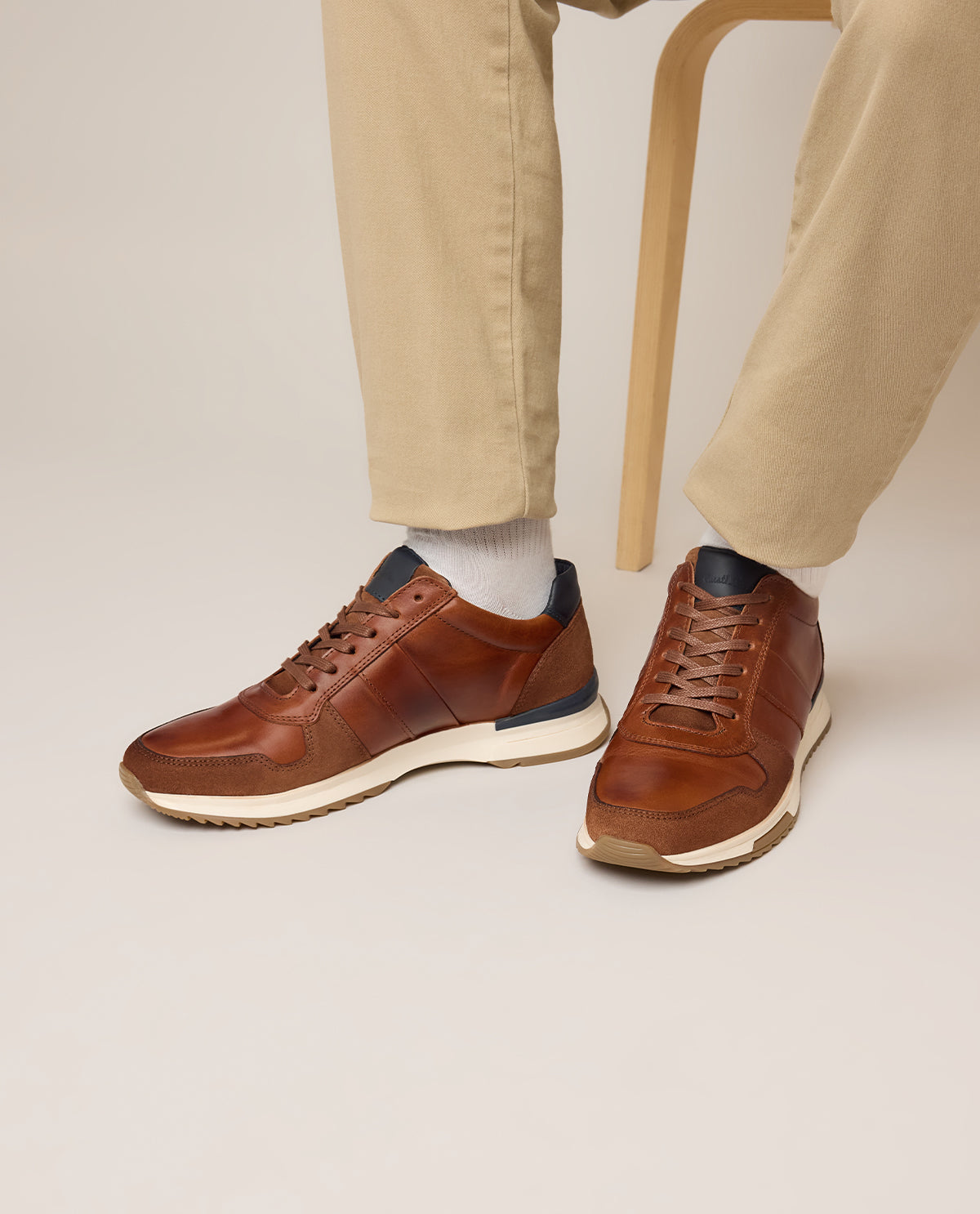 Mit "Ennio" trägst Du Schuhe, die mühelos den Spagat zwischen lässigem Alltag und stilvollem Auftritt schaffen. Das durchdachte Design kombiniert glattes Leder mit samtigen Wildleder-Elementen und sorgt so für eine raffinierte, moderne Optik. Die mehrteilige Konstruktion mit sichtbaren Nähten unterstreicht den handwerklichen Charakter und garantiert zugleich Langlebigkeit. Die abgerundete Schuhspitze mit einer doppelten Lederschicht aus Glattleder und Wildleder sorgt für Stabilität und optische Tiefe, während die flachen, breiten Baumwollschnürsenkel in Braun einen stilvollen Akzent setzen. Der Lederüberzug auf der Zunge mit eingeprägtem Logo verleiht "Ennio" ein hochwertiges Finish.