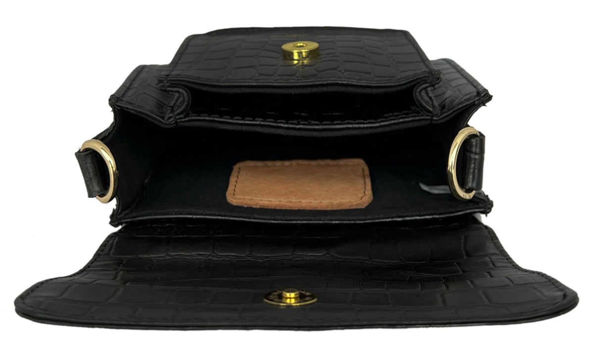 Innen verfügt „Anouk“ über ein Hauptfach und Nebenfach vorne. Abschließen kannst du über einen Magnetverschluss. Darin kannst du Handy, Geldbörse, Lippenstift, Schlüssel etc. verstauen. Darüberhinaus hast du vorne noch ein Nebenfach für die Sachen, die du ad hoc noch gebrauchen könntest. Jetzt noch den Gurt mittels Karabiner an der Tasche befestigen und es kann losgehen!