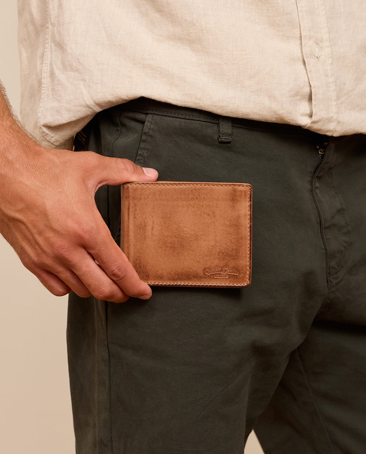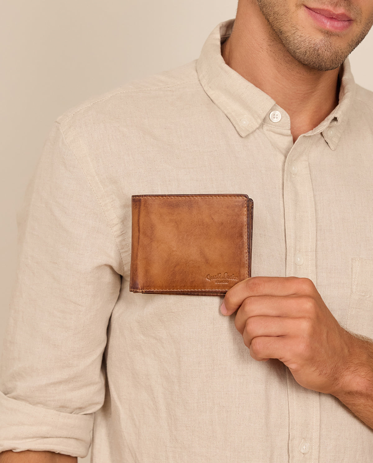 The "Alfred" wallet, made of high-quality leather, is the ideal companion for the modern man who values both quality and elegant design. With its classic shape and robust leather, it not only offers a stylish appearance but also exceptional durability. Thanks to its compact size, it fits easily into any bag, yet is still spacious enough to safely store your most important cards and cash.