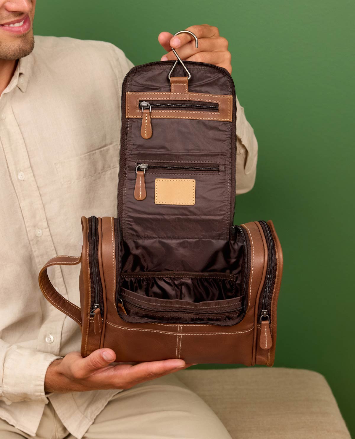 Practical and elegant – the "Chester" toiletry bag made of brown leather