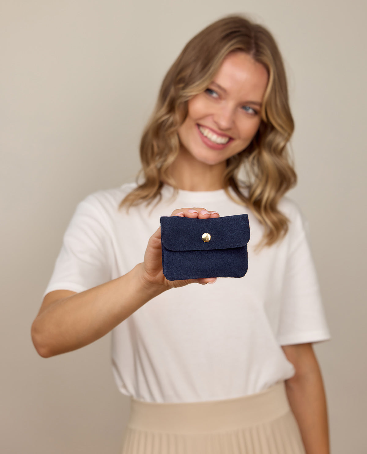 The "Maite" storage bag is the perfect solution to stylishly store your small but important items. Made from high-quality leather with a soft suede look, it offers not only an elegant appearance but also a pleasant feel. Its practical snap closure ensures that your items are securely stored, while the main compartment with a zipper provides additional protection for your valuables. The compact size makes it particularly easy to store the "Maite" in a bag or even in your pocket – ideal for everyday use.