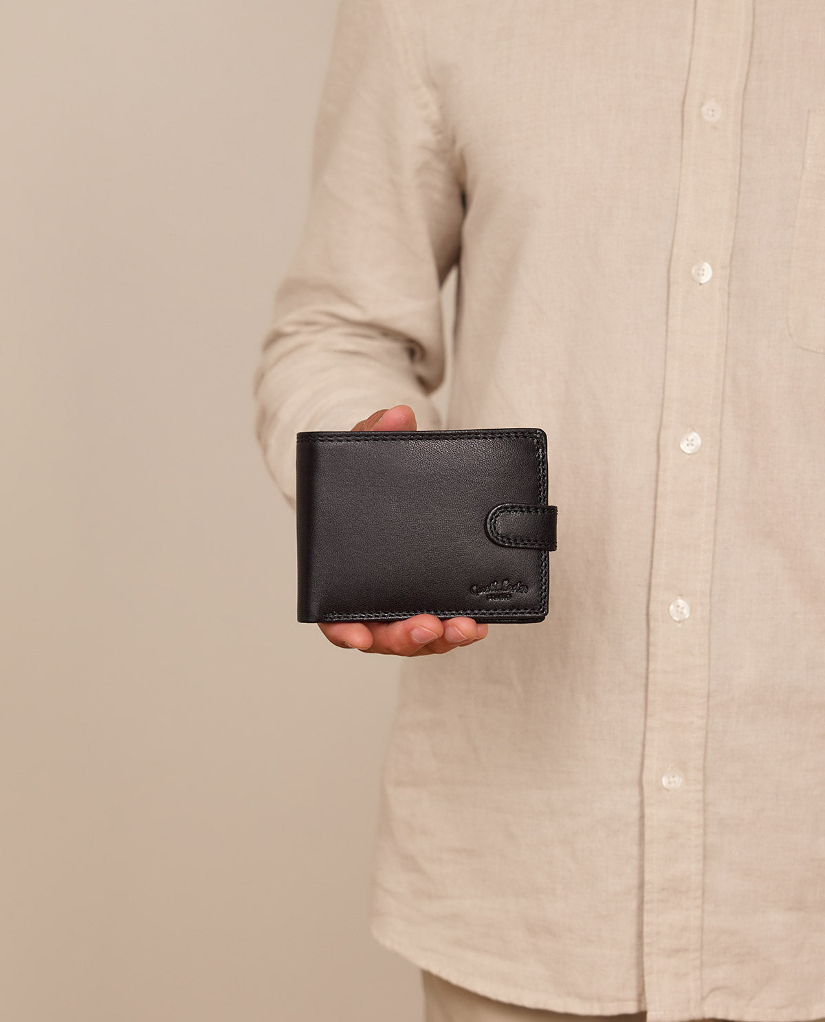 Inside, you are offered maximum comfort in functionality. The clever organization system helps you have your most important cards, IDs, coins, and bills quickly and easily at hand. Where at first glance there doesn't seem to be much space, there is more than you think. Folding techniques and compartments allow you to store everything you imagine. A window with dimensions of 10.5 x 6.5 cm allows you, for example, to show your monthly pass without having to take it out first. The buffalo leather is high-quality processed and extremely robust. It offers you and your wallet great shape stability and promises that you will enjoy this great product for a long time. A snap button connected with a tab closes the wallet simply and uncomplicatedly.