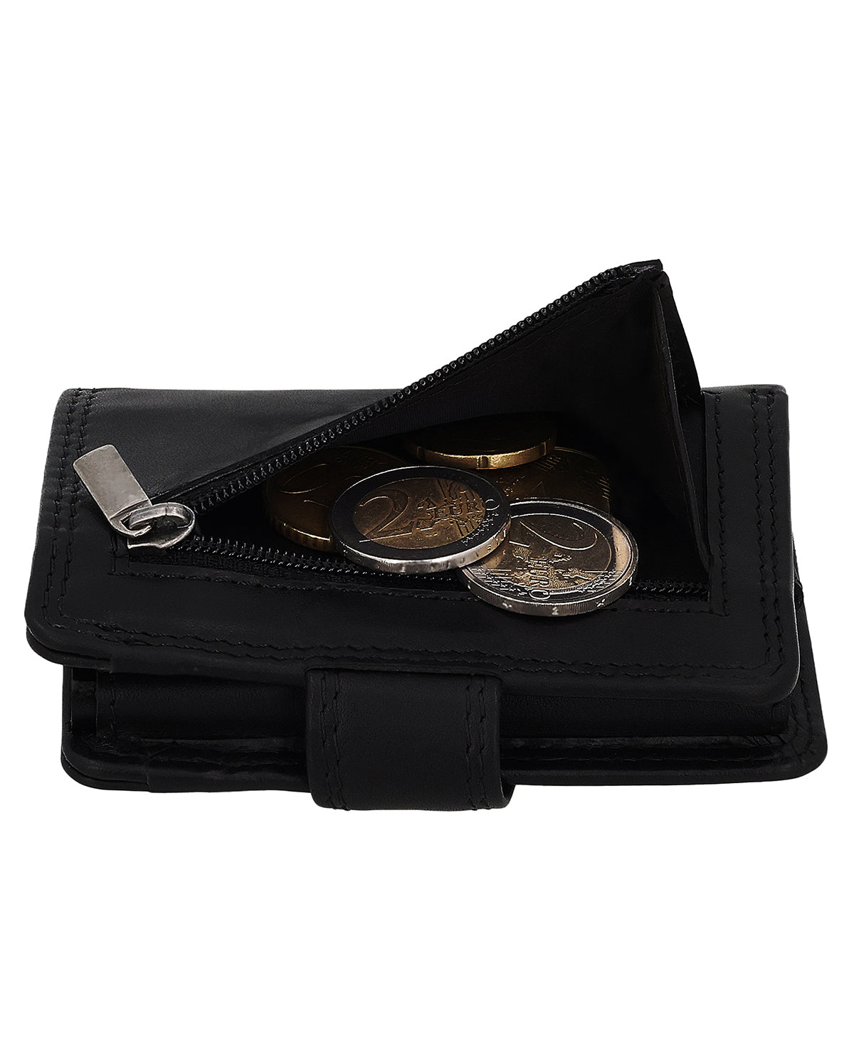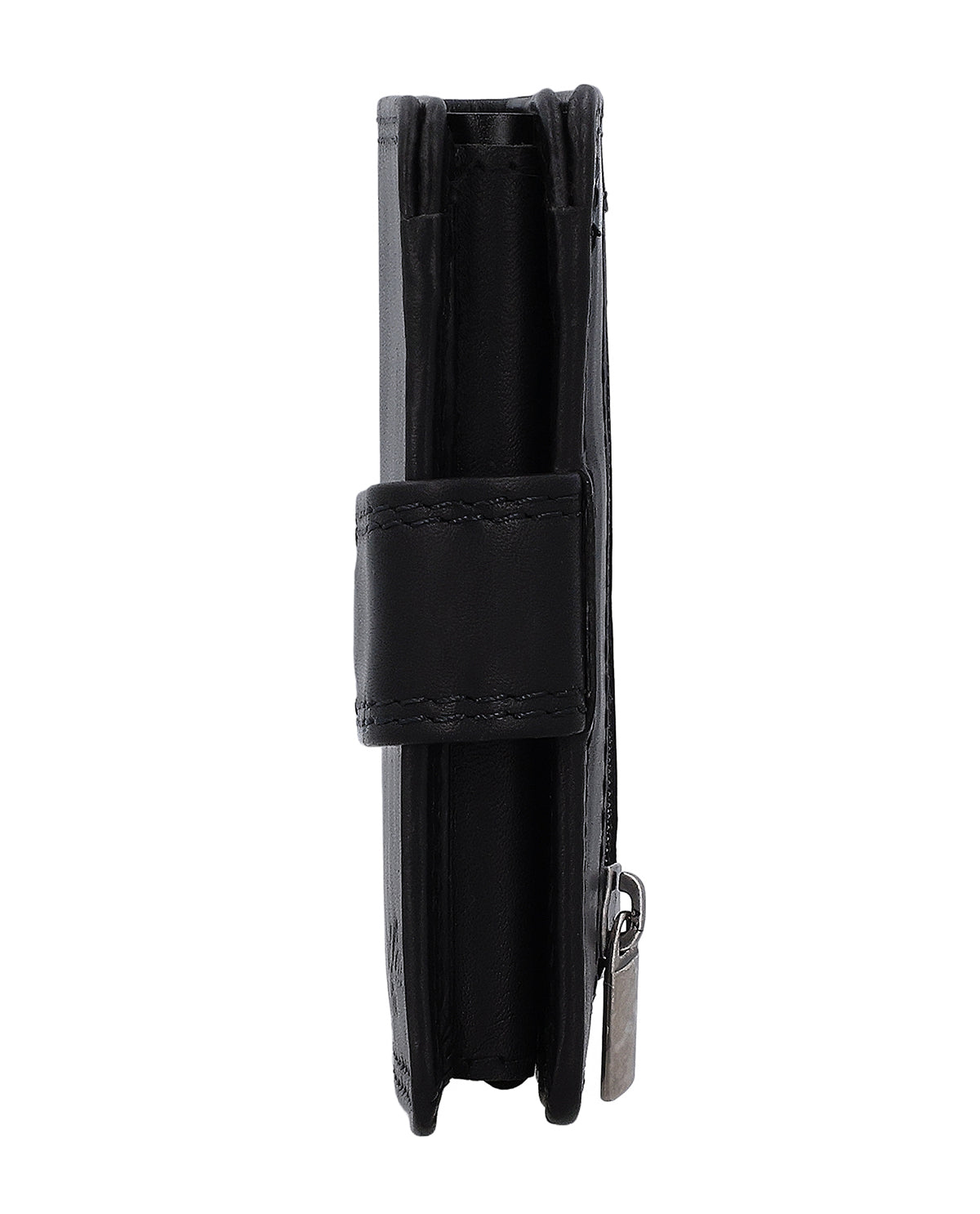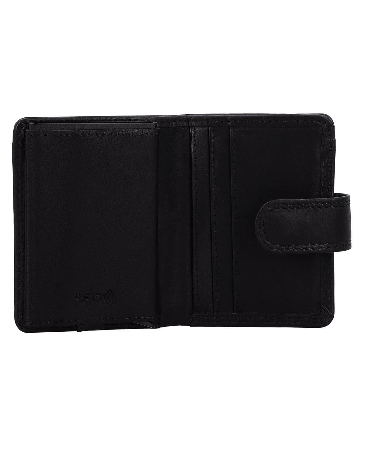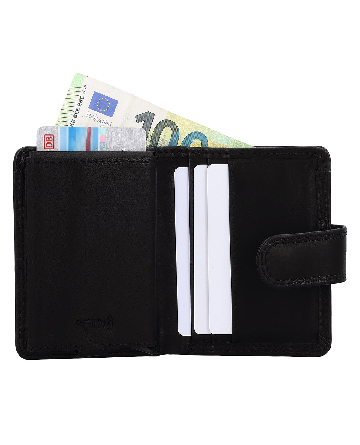 The black "Matheo" wallet is a men's wallet that combines security and functionality in a compact format. Integrated RFID protection safeguards your cards from unwanted scanning, while the aluminum card holder with pop-up mechanism allows quick access to your most important cards. The magnetic strap closure keeps everything securely together and emphasizes the clean, modern design. The double stitching provides additional stability and a high-quality look.